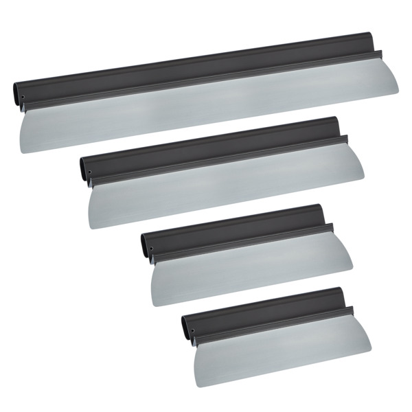 Ergonomiczny profil aluminiowy lakierowany proszkowo z wymiennym piórem ze stali szlachetnej o grubości 0,3 mm i szerokości 9 cm. Lekko zaokrąglone ostrze, przydatne do szpachlowania bez widocznych łączeń. Szerokość: 30, 40, 60, 80 lub 100 cm.
